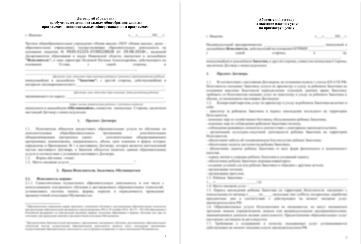 - договоры (бесплатное образование ФГОС, доп. образование, присмотр и уход, организационный взнос, инд занятия с логопедом, психологом, репетитором)