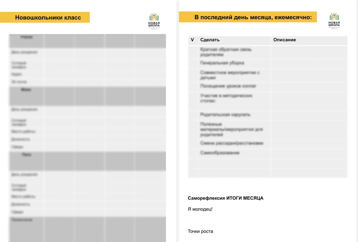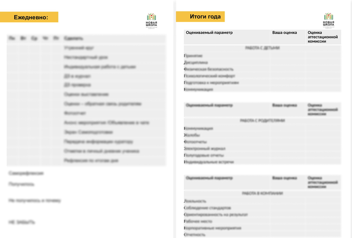 - Формы для саморефлексии, оценки достижений, анализа точек роста и итогов работы.